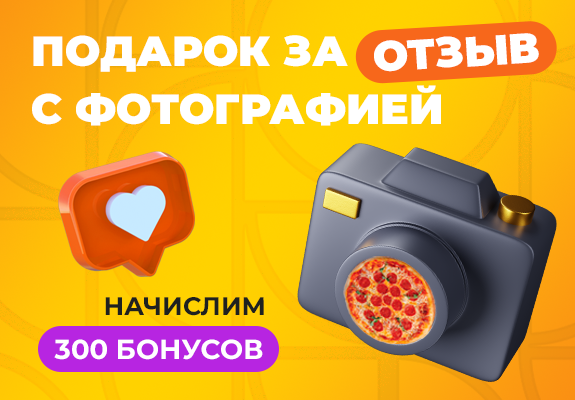 Опубликуйте отзыв на гео-агрегаторах вместе с фотографиями заказанных вами блюд, и получите 300 бонусов на ваш аккаунт! 1 бонус равен 1 рублю и может быть использован для оплаты до 50% от стоимости последующего заказа.